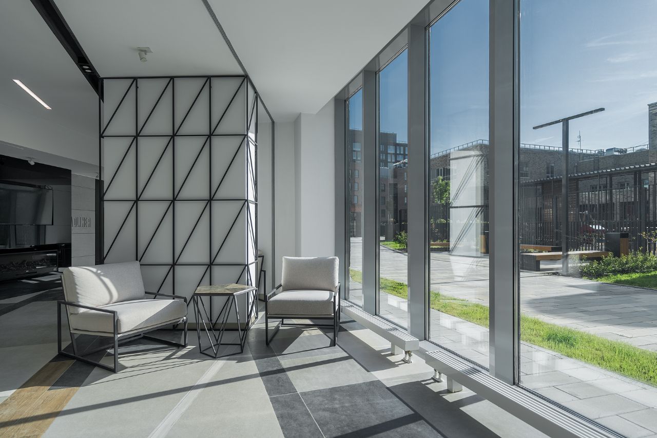 Входы в здания находятся на уровне земли, в холлах есть лаунж-зоны с каминами и стильной мебелью, в подъездах - колясочные и гостевые уборные.